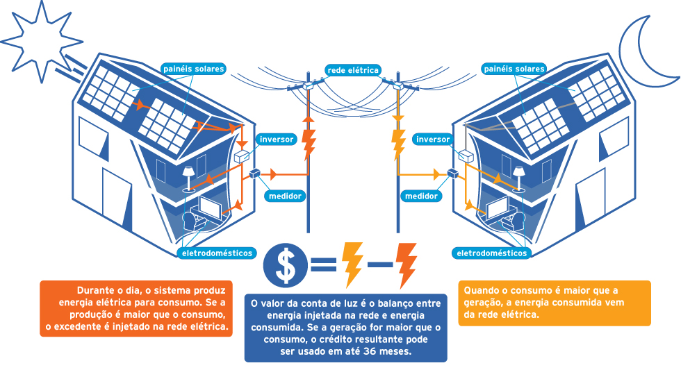 As Resoluções Normativas 482/2012 e 687/2015 da ANEEL estabelecem as condições gerais para a conexão à rede da microgeração (potência instalada menor ou igual a 75kWp) e minigeração (potência instalada entre 75kWp e 5MWp) distribuída no Brasil e criou o Sistema de Compensação de Energia. Este permite que sistemas fotovoltaicos – e outras formas de geração de energia a partir de fontes renováveis com até 5MW de potência instalados em residências e empresas – se conectem a rede elétrica de forma simplificada, atendendo o consumo local e injetando o excedente na rede, gerando créditos de energia. Desta forma, é possível praticamente zerar a conta de luz com o uso da energia solar, pagando apenas o custo de disponibilidade da rede.Quando um sistema fotovoltaico estiver gerando eletricidade, esta será consumida no local. Caso a geração seja maior que o consumo, o excedente é injetado na rede elétrica, gerandocréditos de energia. Quando a geração for menor do que o consumo, será utilizada a energia da própria rede elétrica. Os créditos de energia possuem o mesmo valor da eletricidade da rede e podem ser utilizados para abater o consumo, diminuindo assim o valor da conta de energia.